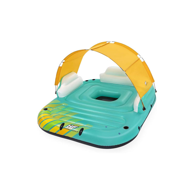 The Bestway Sunny Lounge Island is a spacious, inflatable float designed for up to 5 adults. Made from durable vinyl, it features built-in cup holders, grab handles, and a mesh floor for comfort. The removable canopy provides shade, while the heavy-duty handles and anchor bag ensure stability. Perfect for relaxing on lakes or large pools.