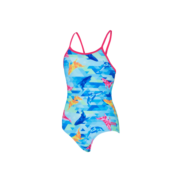 Dive like a dolphin with Zoggs Dolphine Sprintback! Featuring geometric dolphins and whales, your junior girl will love this sporty swimsuit! With contrasting thin, sporty straps and an open back design, this suit allows maximum freedom of movement for swimming with ease. Not only is it eco-friendly, designed in Zoggs innovative Ecolast™ fabrication made with plastic bottles, it's also highly chlorine resistant, stands up to sunscreen and is soft to the touch too.