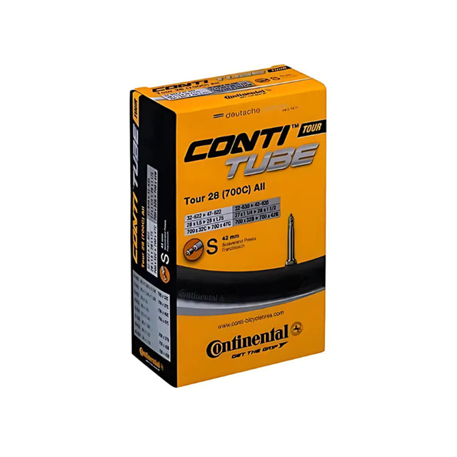 The Continental Tour Tube All 28" S42 is a versatile and reliable inner tube designed for 28-inch (700c) wheels. Crafted from high-quality butyl rubber, it offers excellent air retention and durability, making it ideal for city, touring, and trekking bikes. The 42mm Presta valve ensures compatibility with a wide range of rims, and the tube's seamless construction provides a smooth and consistent ride.